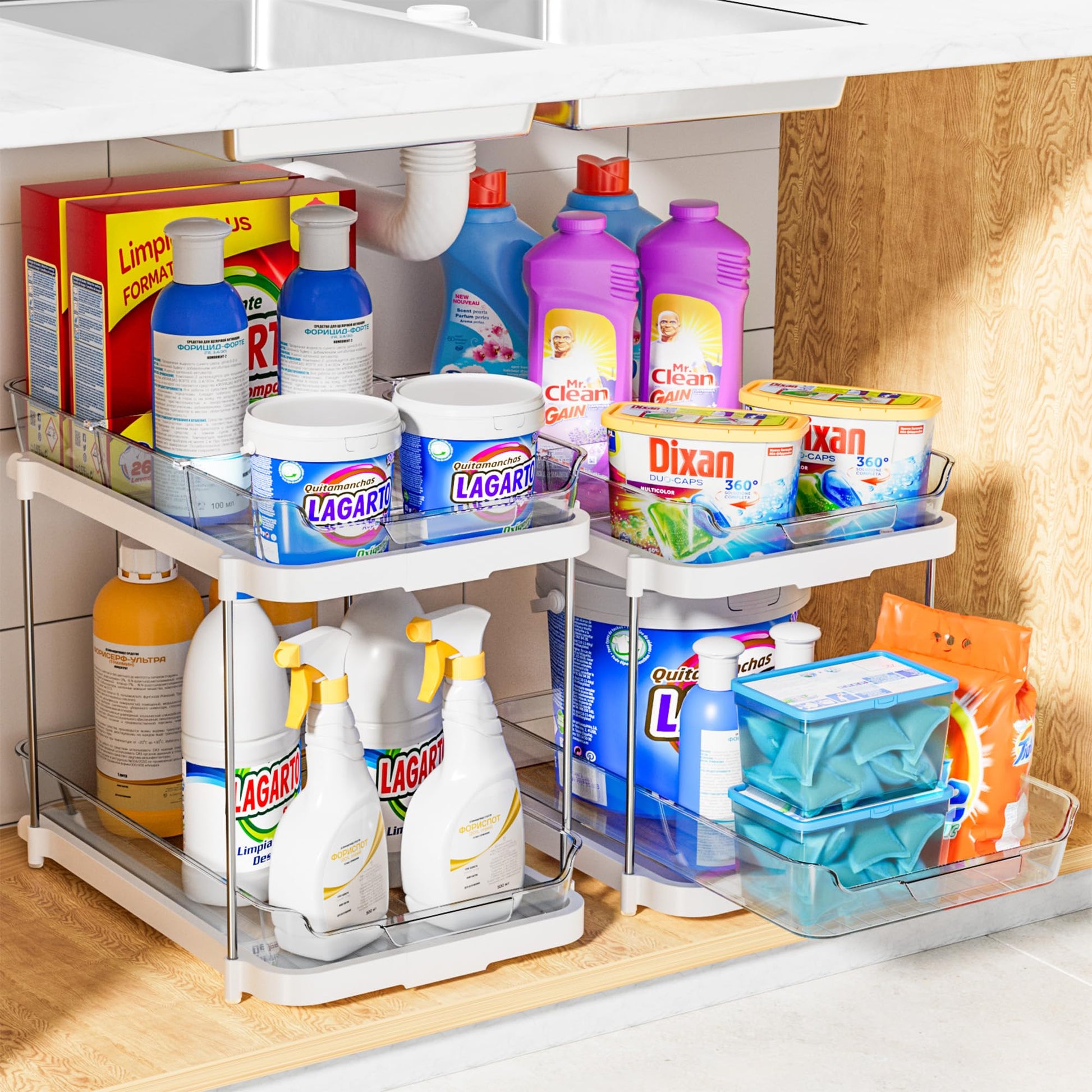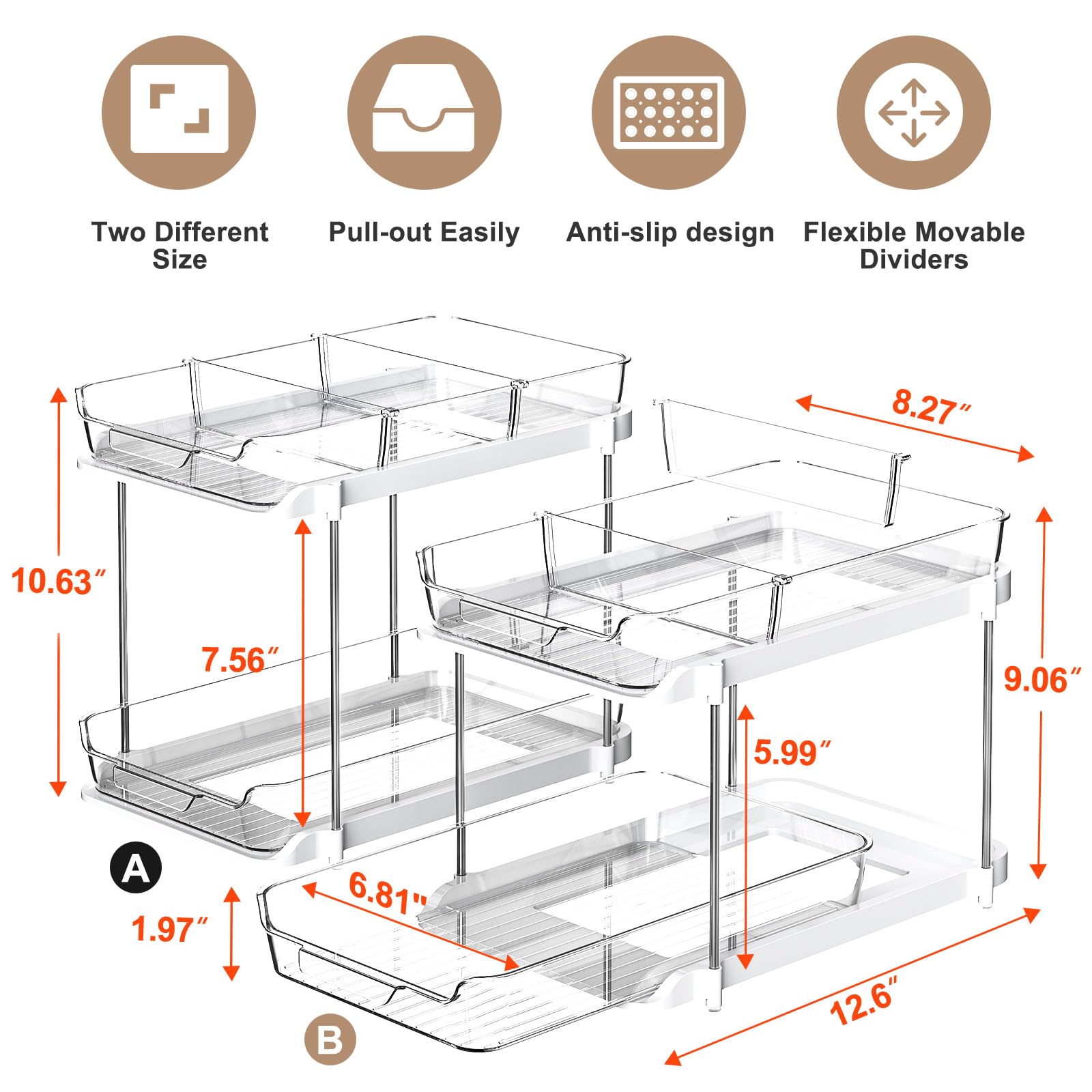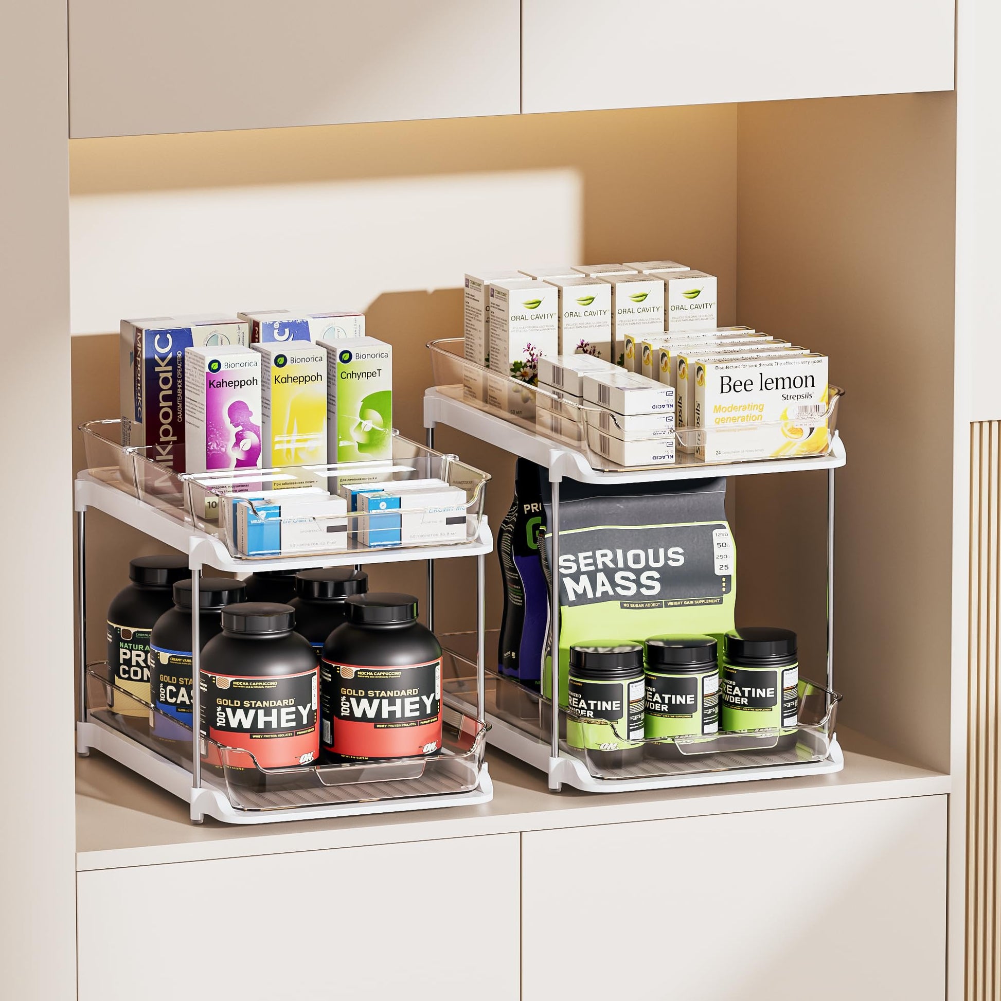 2 Sets of 2-Tier Multi-Purpose Bathroom Under Sink Organizers and Storage, Stackable Kitchen Pantry Organization, Pull Out Medicine Cabinet Organizer with 8 Movable Dividers