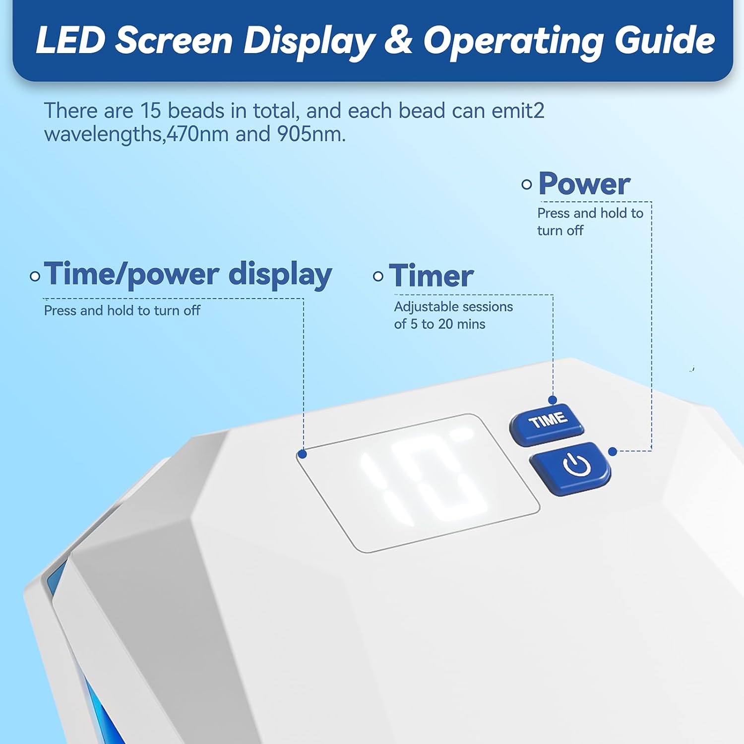 - 💙【Toenail-fungus-treatment-device】This toenail fungus treatment device is equipped with 15 dual-wavelength LEDs, each capable of emitting two wavelengths, 470 nanometers and 905 nanometers. It can effectively penetrate deep into the nail bed, reaching the tissue area where fungus colonies are reproducing. It effectively eliminates the fungus and restores the normal form of the fingernail or toenail.